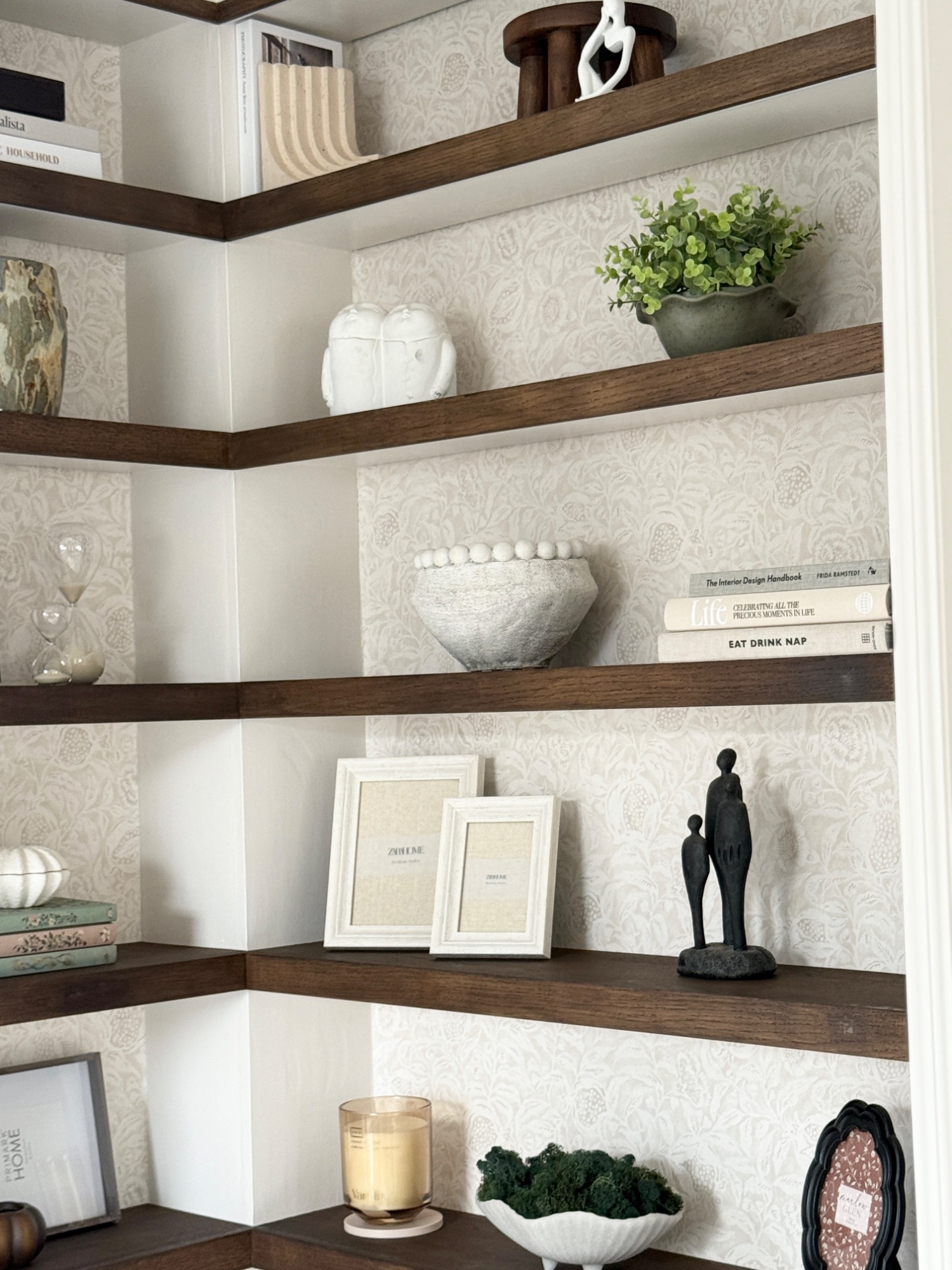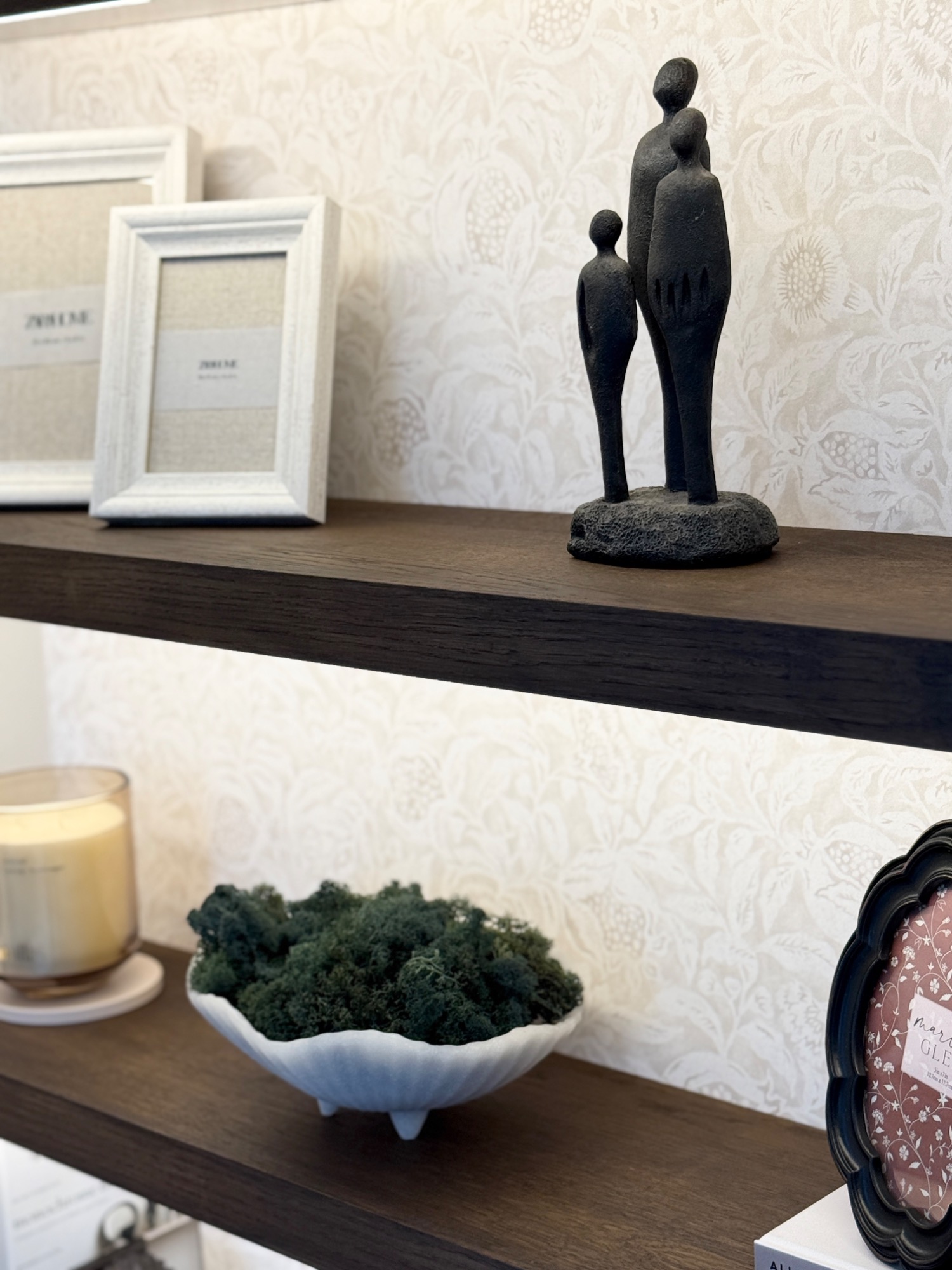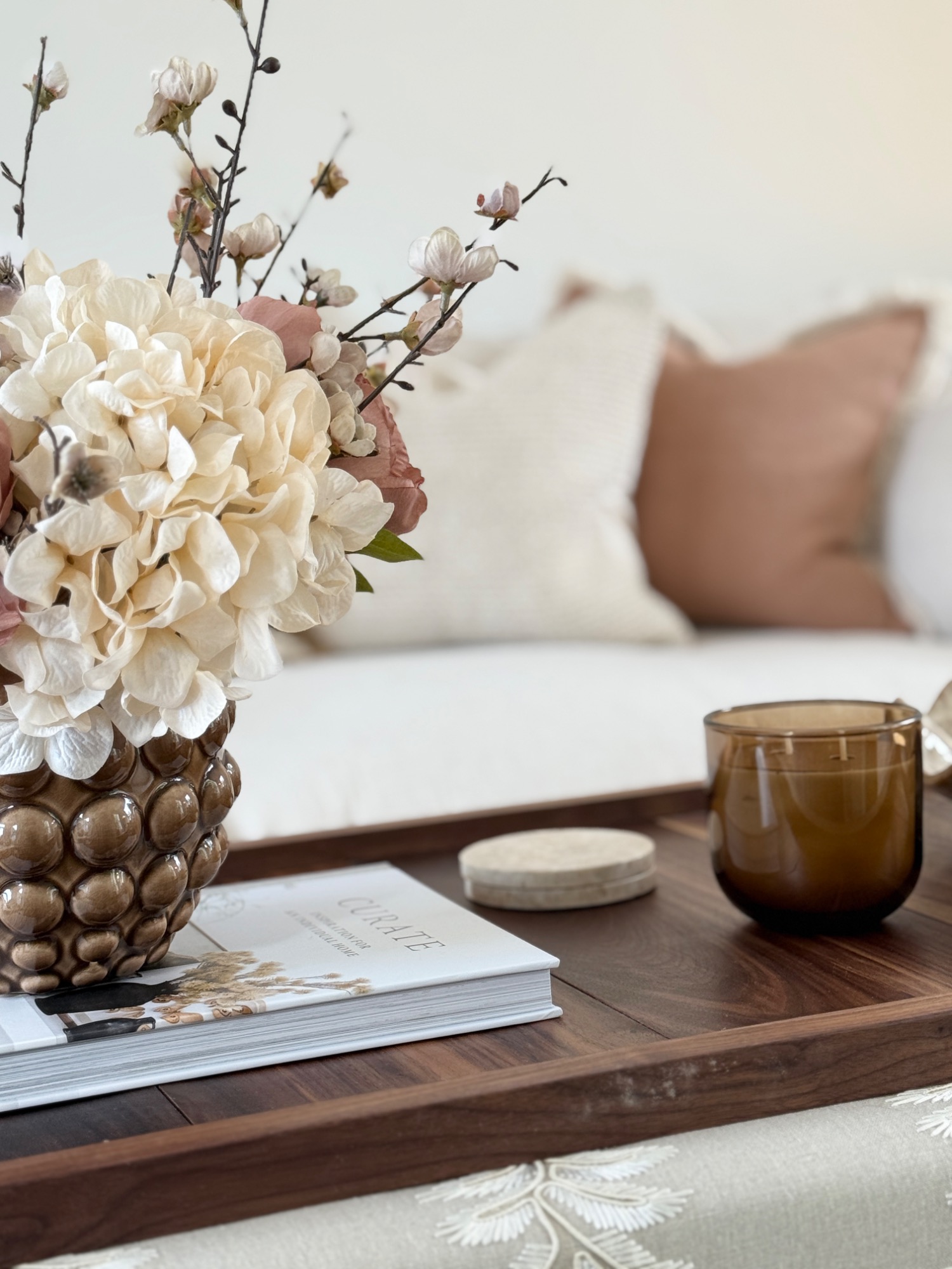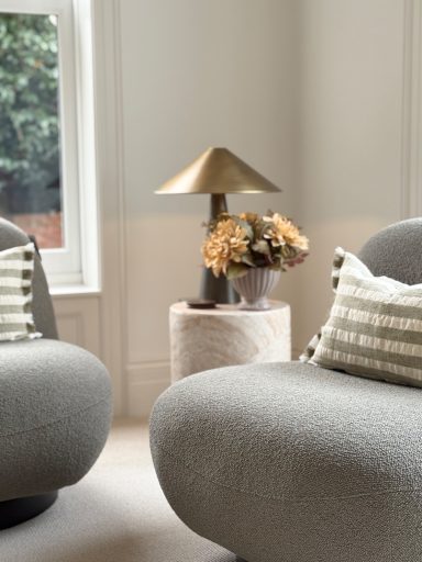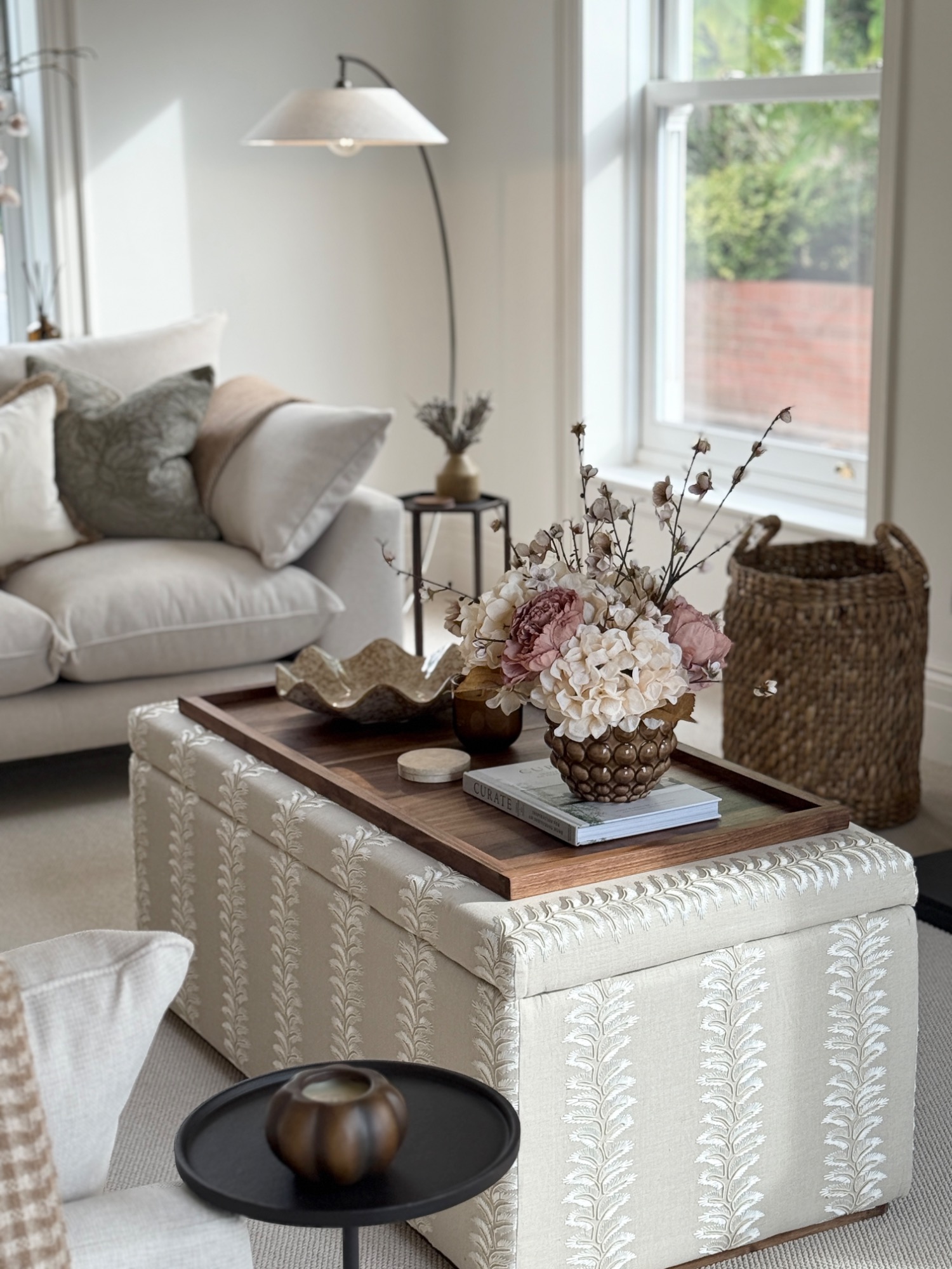 A formal family living room, where neutral texture and pattern blends seemlessly with rich walnut to create a peaceful sanctuary.